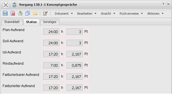 Soll-Aufwand: Dieses Feld wird im Rahmen der Planung vom System bestimmt und definiert die voraussichtliche Projektdauer in Stunden bzw. Tagen. Während der Planung wird dieser Wert aktualisiert (analog zum Plan-Aufwand) und wenn die Planung abgeschlossen wird (Statusübergang auf “Vorleistung” oder “aktiv”) wird dieser Wert nicht mehr verändert.
