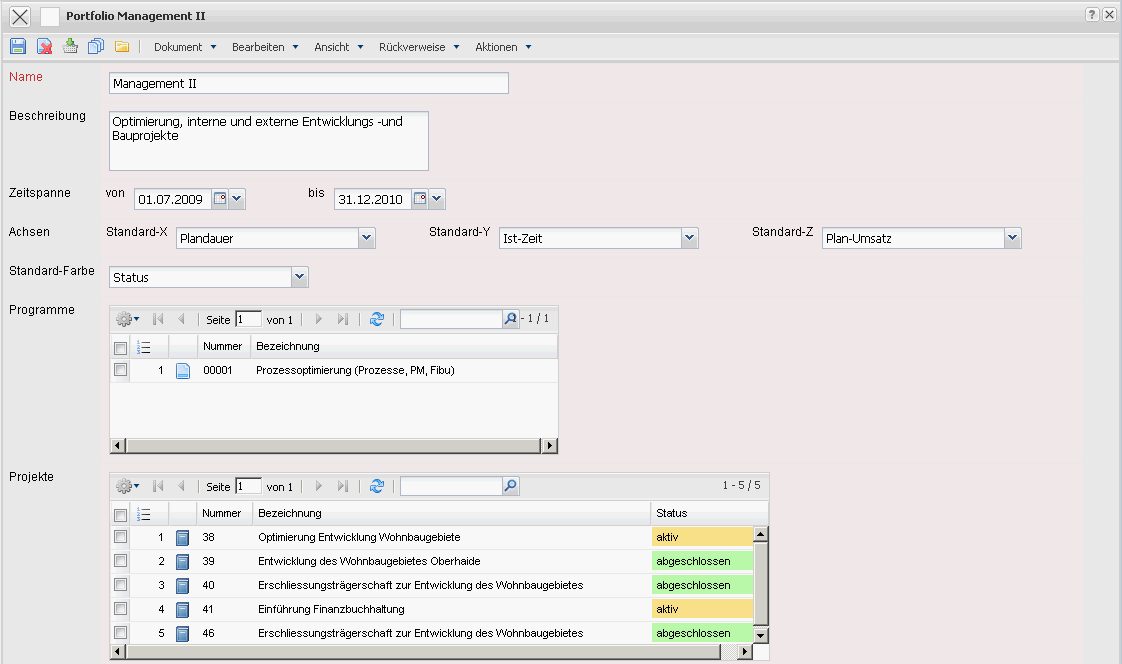 Basis des Projektportfolio-Managements sind die Zusammenstellungen von Projekten. In dieser Maske können die Projekte zusammengestellt werden und die Achsen für die Auswertungen vordefiniert werden.