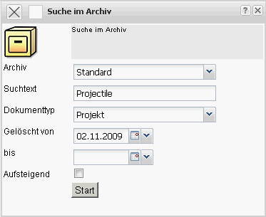 Alle gelöschten und/oder archivierten Datensätze von Projectile werden bei Verwendung des Archivs während des Löschvorgangs als XML-Daten auf den Webserver abgespeichert. Mit Hilfe des Archivs können diese Daten selektiert und wieder in die Datenbank überführt werden.