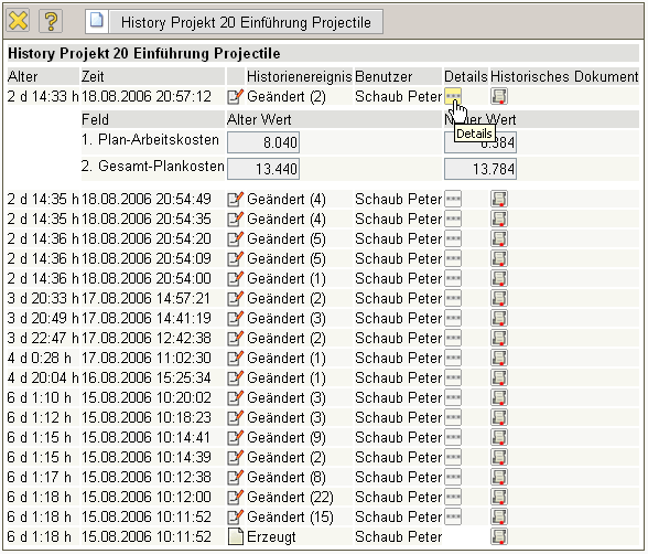 Die Historie protokolliert alle Änderungen eines Datensatzes. Dazu gehört das Anlegen neuer Datensätze, die Veränderungen auf Feldebene und das Löschen von Datensätzen. Die Daten der Historie werden in der Projectile-Datenbank verwaltet und enden mit den Löschvorgang, d.h., wenn ein Dokument nach den Löschen mit Hilfe der Papierkorb-Funktionalität wieder hergestellt wird, ist die ursprüngliche Historie des Dokumentes nicht mehr vorhanden.