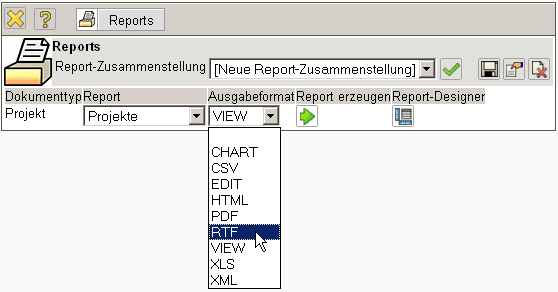 Als Ausgabeformat für die erzeugten Reports kann zwischen CHART, CSV, EDIT (zum Editieren von Stammdaten), HTML, PDF, RTF (Standardformat für Textverarbeitungen), View (Browseransicht), XML und XLS (MS EXCEL) gewählt werden.