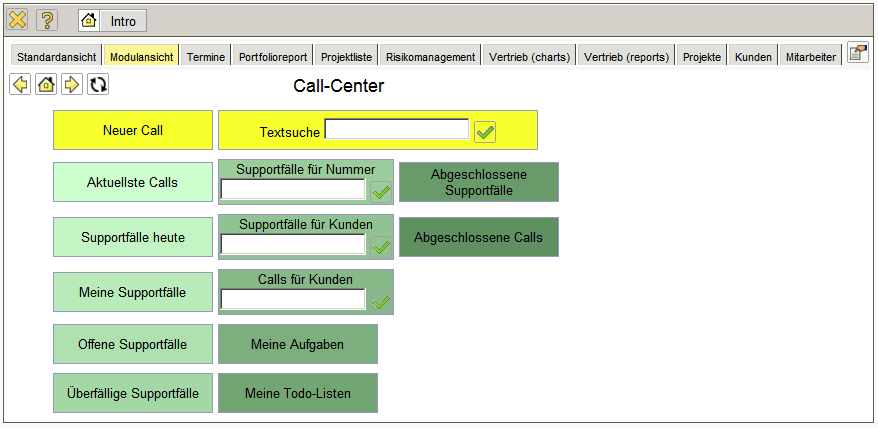 Im Modul Call-Center können ein- und ausgehende Calls, die daraus entstehenden Supportfälle und die zugeordneten Nachrichten verwaltet werden. Im Eingangsbildschirm “Modulansicht” können die Funktionalitäten im Menüpunkt “Zusatzmodule” aufgerufen werden.