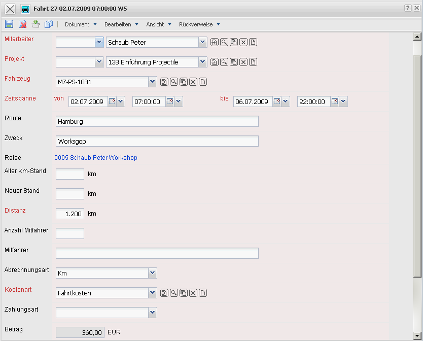 Die Maske Fahrt ermöglicht die Erfassung von projektbezogenen Fahrten und deren Kosten (commuting expenses), die der Fahrer eines Fahrzeuges im Rahmen eines Projektes verursacht hat. Die Fahrtkosten können durch Auswahl einer bereits erfassten Reise über die Kennzeichnung dieser Reise zugeordnet werden und werden so auch in dem Dokumenttyp Reisen mit ihrer entsprechenden Kostenart angezeigt. Es besteht grundsätzlich die Möglichkeit, nach Km-Pauschale (Distanz aus Km-Stand alt und neu), nach der Abrechnungsart Stunden (als Differenz aus Fahrtbeginn und Fahrtende) oder als Kombination von beidem, die Fahrtkosten zu bestimmen. Die entsprechenden Sätze sind in der Maske Konfiguration hinterlegt.