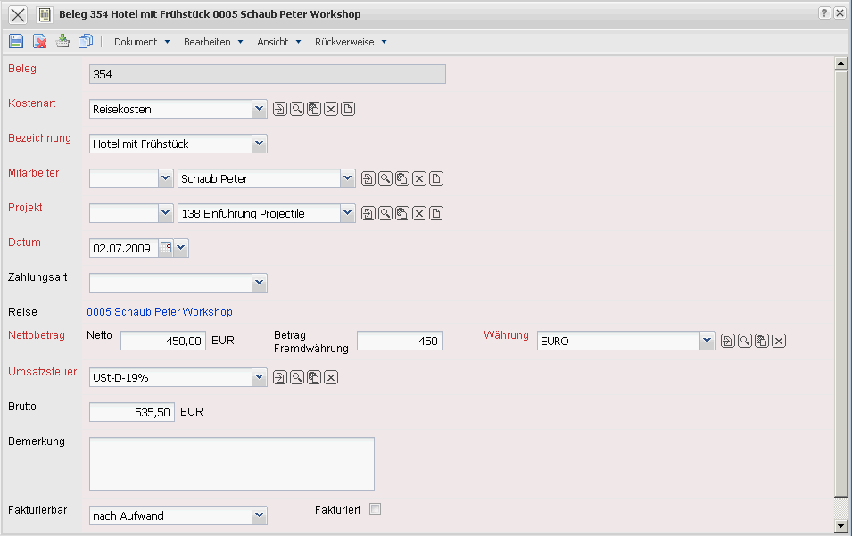 Die Maske Beleg verwaltet alle Belege im System. Grundsätzlich können hier alle Kosten für die Belege existieren und die ein Mitarbeiter verursacht hat, erfasst und einem Projekt zugeordnet werden. Dazu gehören auch Belege die inhaltlich zu Reise- und/oder Fahrtkosten zählen. Die Belege können durch Auswahl einer bereits erfassten Reise zugeordnet werden und werden in dem Dokumenttyp Reisen mit ihrer entsprechenden Kostenart angezeigt. Durch Angabe des Netto-Betrages und der Umsatzsteuer, wird der Gesamtbetrag errechnet (oder durch Eingabe des Bruttobetrages der entsprechende Nettobetrag). Zusätzlich kann noch die Kostenart und das Belegdatum angegeben werden.