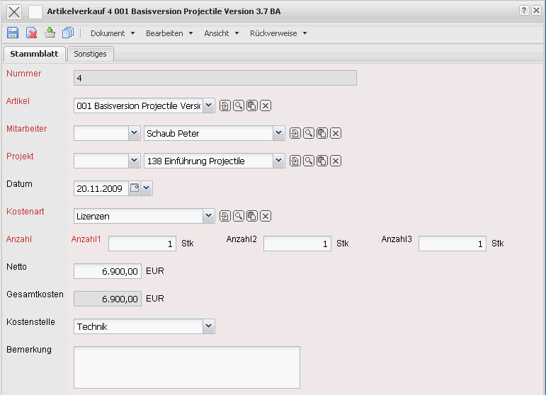 Die Maske Fremdkosten ermöglicht die projektbezogene Abrechnung/Weiterbelastung von Fremdleistungen bzw. Artikeln. Die Anzahl der im Modul Stammdaten definierten Fremdleistungen (beispielsweise Artikel oder Lizenzen) werden einem Projekt zugewiesen. Der Verkaufspreis wird dabei mit dem empfohlenen Verkaufspreis des Artikels vorbelegt und der entsprechende Gesamtpreis angezeigt.