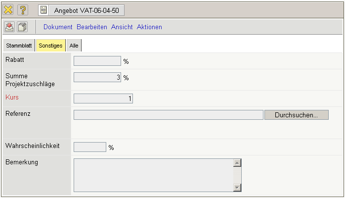 • Wahrscheinlichkeit: Dieses Feld dient zur Hinterlegung der Angebotswahrscheinlichkeit (in Bezug auf die Annahme des Angebotes) und kann für Auftragsauswertungen verwendet werden.