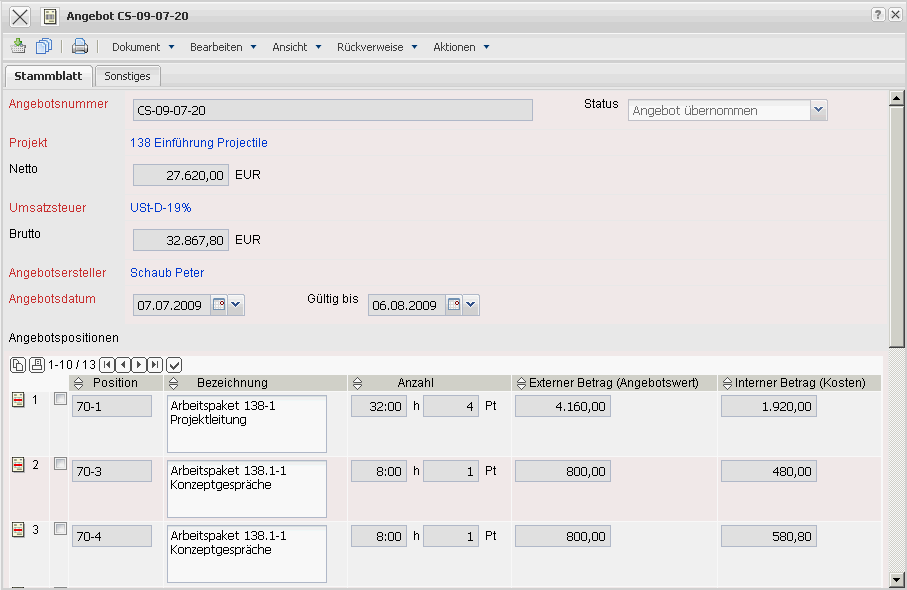 Die Maske Angebot realisiert die Angebotserstellung für ein ausgewähltes Projekt oder Unterprojekt. Ein Angebot kann nur für externe Projekte erstellt werden. Diese Maske beinhaltet die Informationen zum Angebotsbetrag, dem Ersteller des Angebotes, das Angebotsdatum und die zugehörigen Angebotspositionen.