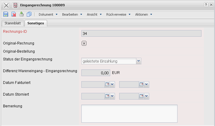 • Datum Storniert: Bei der Stornierung der Eingangsrechnung wird hier das Datum und die Uhrzeit vom System gesetzt.