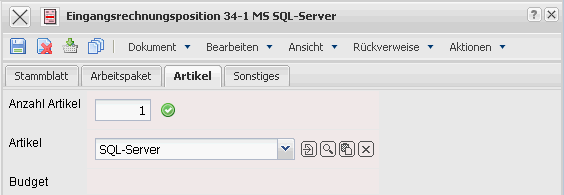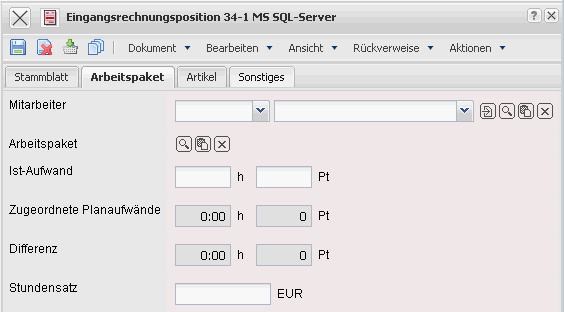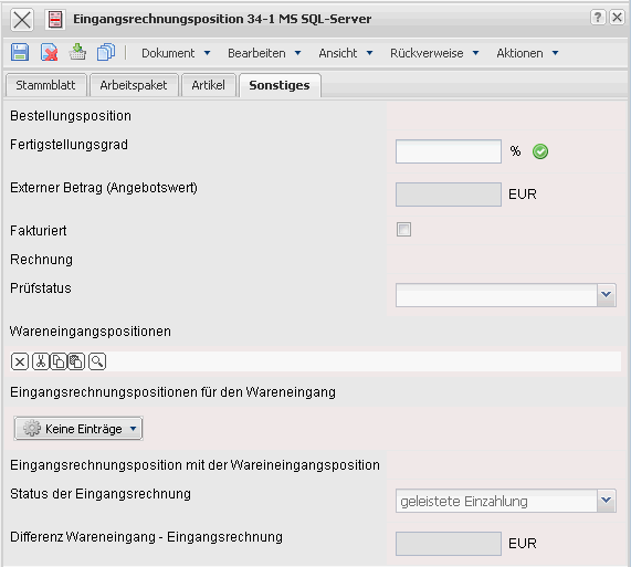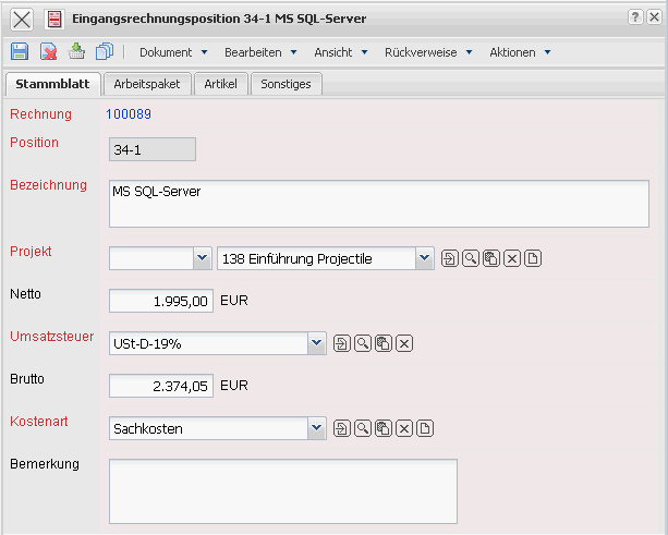 Die Maske Eingangsrechnungsposition verwaltet die Positionen der Eingangsrechnungen. Dieses Dokument beinhaltet Informationen über das Projekt, den Netto- und Bruttobetrag der Position, der Umsatzsteuer, der Kostenart und die Information, ob die Position bereits fakturiert wurde.