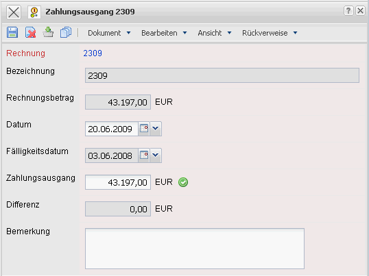 Die Maske Zahlungsausgang verwaltet die Zahlungsflüsse im Bezug auf die Fremdrechnungen (Eingangsrechnungen). Die Zahlungsausgänge beinhalten Informationen über Rechnungsbetrag, Datum und Betrag des Zahlungsausganges. Darüber hinaus wird die Differenz zwischen der Rechnungssumme und dem Betrag des Zahlungsausgangs ausgewiesen.