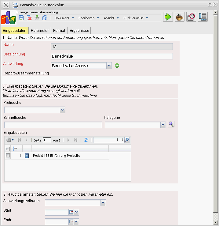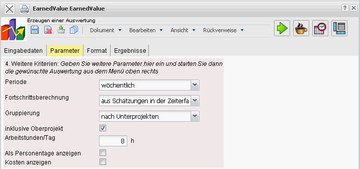 Die Auswertung Earned-Value-Analyse listet für ein Projekt über beliebige Perioden die Plan- und Istaufwände (in Stunden oder Personentagen) sowie den Fertigstellungsgrad (Fortschritt zur Vorperiode) ab. Aus diesen Daten wird der sogenannte Earned Value und weitere Kennzahlen (BCWS, ACWP und BCWP) bestimmt. Das besondere an der Earned Value Analyse ist, dass neben den Plan und den Ist-Werten als dritte Größe der gleichen Einheit der BCWP zur Projektbeurteilung herangezogen wird.