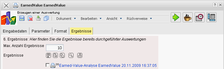 Auswertung: Die Earned Value Analyse beinhaltet die Earned Value Analyse. Diese Auswertung generiert die Earned Value Analyse für ein ausgewähltes Projekt. Dabei werden periodisch die Planwerte, die Ist-Werte und der Fortschritt für die Projektstruktur oder weitere Kriterien abgetragen. Der Earned Value ergibt sich aus dem Fortschritt der Periode (Differenz vom Fertigstellungsgrad der betrachteten Periode zur Vorperiode) und dem Gesamtplanaufwand. Darüber hinaus werden hier die Kennzahlen BCWS, ACWP und BCWP bestimmt und die Ergebnisse in zwei Abbildungen visualisiert.
