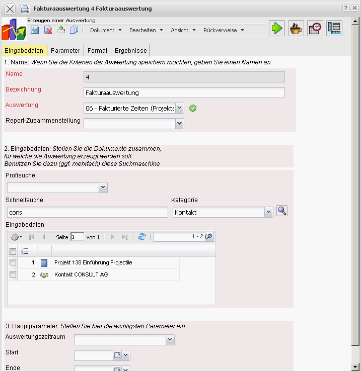 Die Fakturaauswertung erzeugt die finanziellen Auswertungen im System. Dazu gehören u.a. die Kostenauswertungen (Plan/Ist-Vergleiche, also Budgets zu Kosten sowie die Detailauswertung), die allgemeine Fakturaauswertungen (Angebote, Budgets, Rechnungen, Kosten, Zahlungsflüsse und Deckungsbeitrag inklusive Detailauswertung), Übersichten über fakturierbare und fakturierte Leistungen, eine Auflistung der offenen Posten und die Ergebnisauswertung.