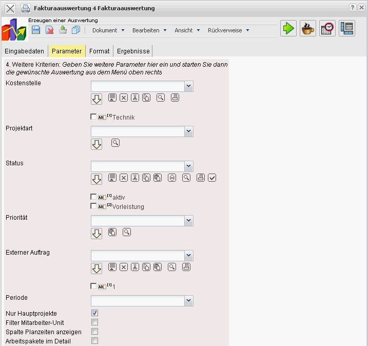 Nur Hauptprojekt: Diese Checkbox kennzeichnet, ob in der generierten Auswertung nur die Hauptprojekte ohne Unterprojekte angezeigt werden.