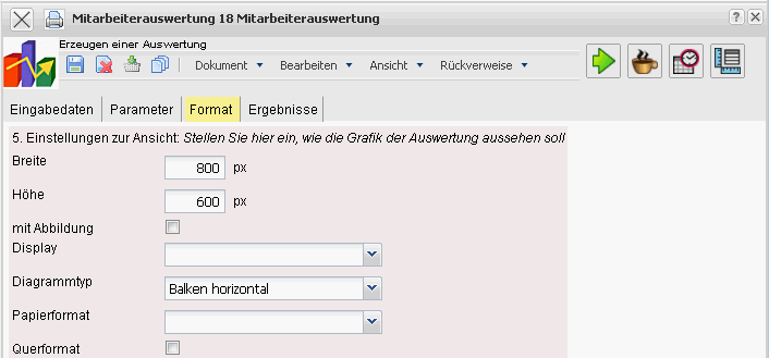 Display: Mit Hilfe dieser Auswahl kann die erzeugte Auswertung in verschiedenen Formaten erzeugt werden. Unterstützt werden
