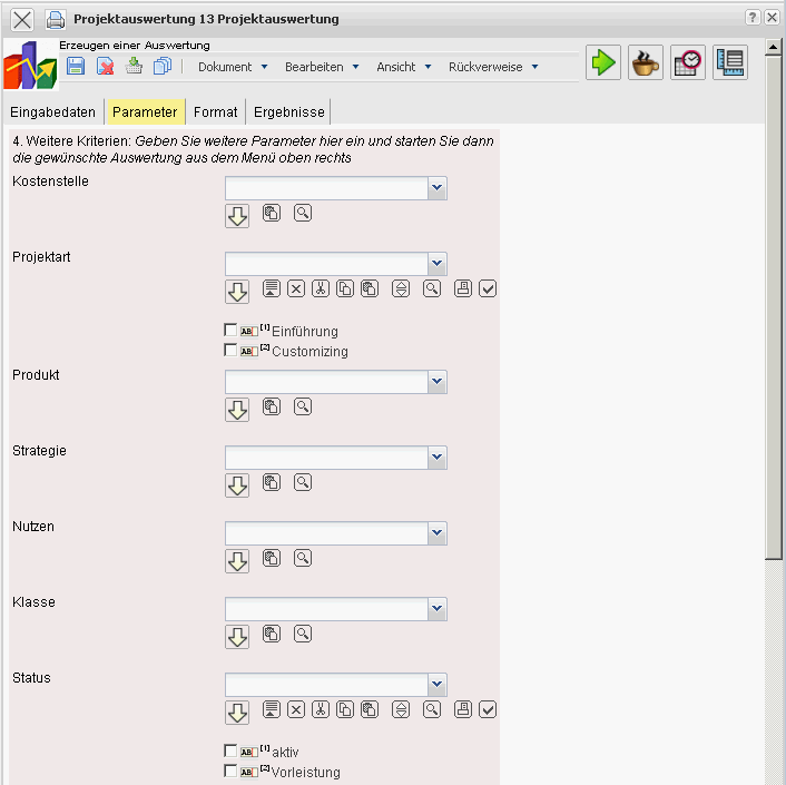 Status: In dieser Auswahlbox können als Selektionskriterium Status (passiv, aktiv, Vorleistung, …) ausgewählt werden. Dieser Status bezieht sich auf die Angaben des Projektes und schränken entsprechend die Auswahl des Projektes ein (es werden nur Projekte angezeigt, die diesen Status haben).