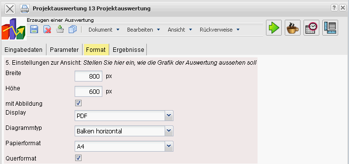 Querformat: Mit Hilfe dieser Option kann die Auswertung als Querformat angezeigt und ausgedruckt werden.