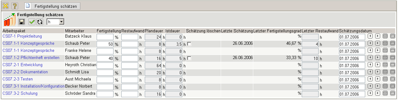 Für das Projektcontrolling wird als Vergleichsgröße entweder der Fertigstellungsgrad oder der Restaufwand benötigt. Diese Schätzungen können im TimeTracker (vom Mitarbeiter) oder im Dialog “Fertigstellung schätzen” (beispielsweise vom Projektleiter) hinterlegt werden. Darüber hinaus können Fertigstellungsgrade im Projekt (siehe auch die Masken Projekt und Fertigstellungsgrad) hinterlegt werden.