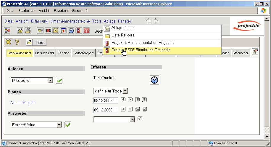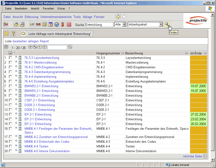 … angezeigt. Durch Mausklick auf einen Link in dieser Trefferliste (hier Projekt EP Einführung Projectile) …