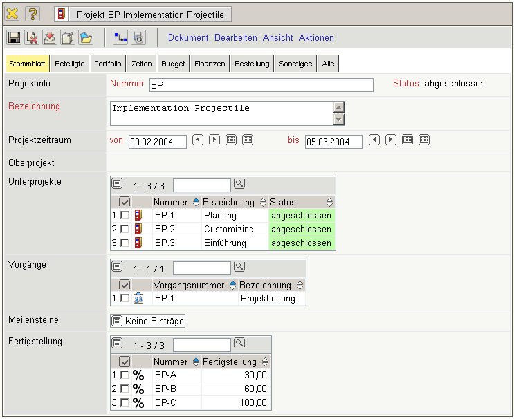 … angezeigt. Durch Mausklick auf einen Link in dieser Trefferliste (hier Projekt EP Einführung Projectile) …