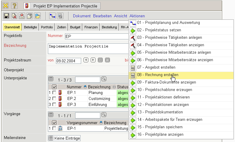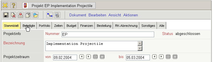 Projectile besteht größtenteils aus Masken, das Beispiel zeigt eine Projektmaske. Alle Masken im System, mit Ausnahme der Auswertungen und des TimeTrackers, haben den selben Aufbau.