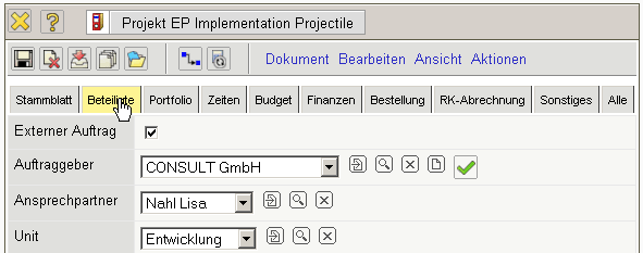 Einige Masken enthalten Reiter. Die Reiter sorgen für eine bessere Strukturierung der Masken und für mehr Übersichtlichkeit gerade bei Masken mit vielen Elementen. Die Reiter können in den XML-Templates vom Administrator konfiguriert werden (siehe Administrationsleitfaden).