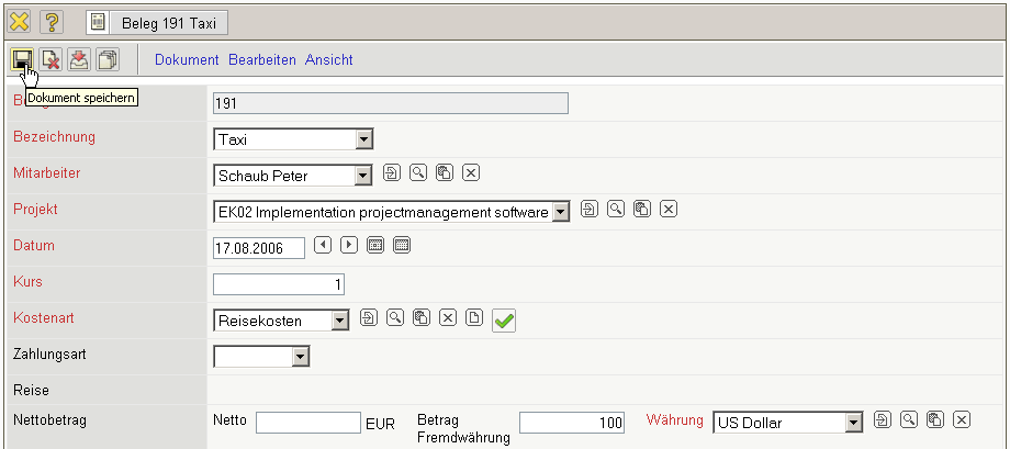 Im Beispiel wird die Zweitwährung auf US Dollar (USD) geändert, der Betrag von 100 USD eingeben und nach dem Abspeichern des Dokumentes wird der fehlende Wert …