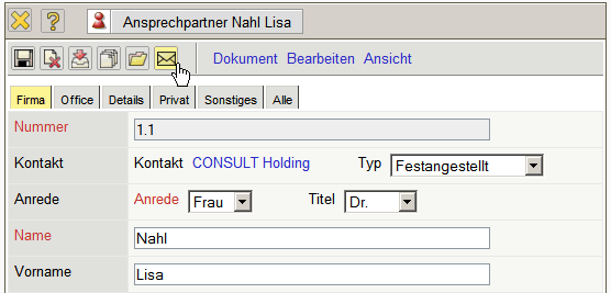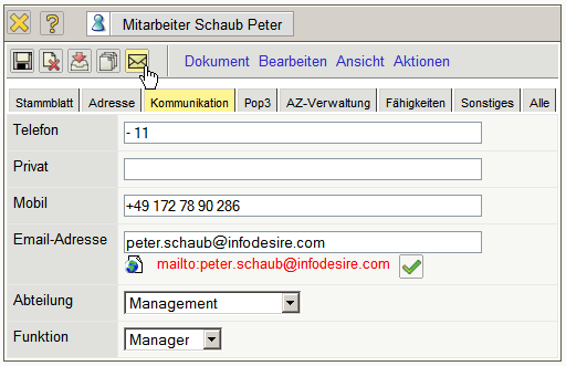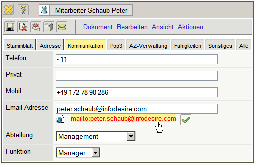 In der Mitarbeiterverwaltung kann für jeden Mitarbeiter wahlweise der Email-Link oder die Mailfunktionalität verwendet werden. Der Link auf die Email-Adresse …