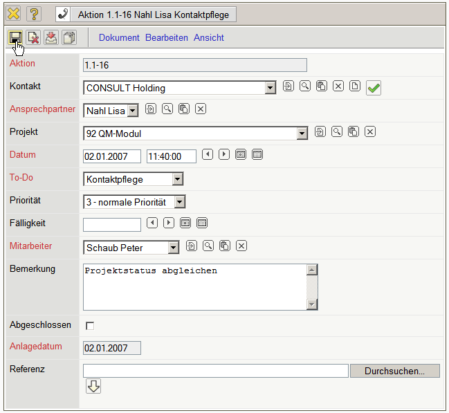 Im Beispiel wird eine Wiedervorlage für die Projektleiterin des Kundens zum 02.01.2007 definiert.