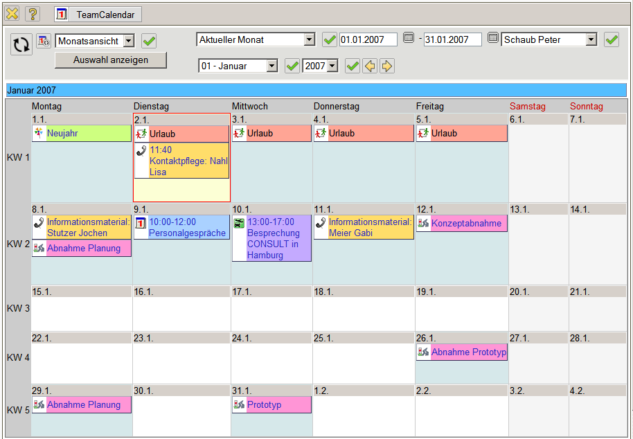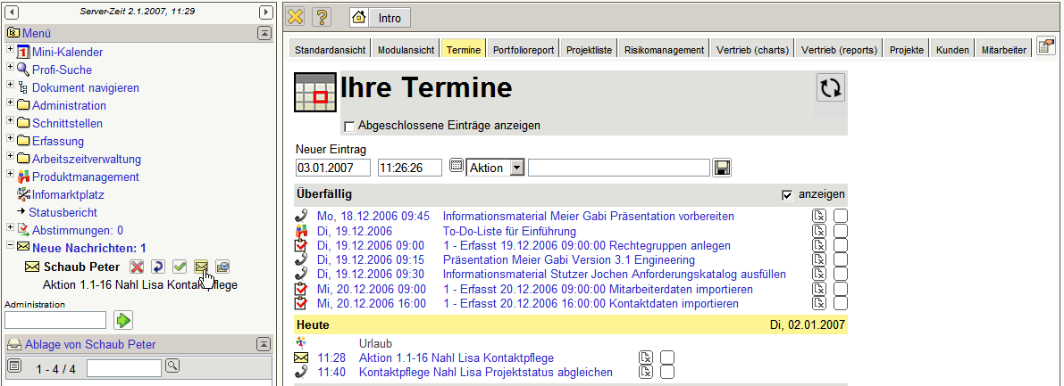 Wenn die optionale Komponente Gruppenterminkalender verwendet wird, erscheint diese Aktion auch im Gruppenterminplaner (hier als Termin von Peter Schaub am 02.01.2007) und kann von hier geöffnet werden.