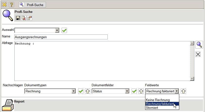 Im nächsten Schritt wird die Abfrage konkretisiert. Es sollen nur noch alle fakturierten Rechnungen übernommen werden. Diese Information befindet sich im Dokument Rechnung und das Feld hat den Namen Status. Mit Hilfe des Assistenten können die Felder des ausgewählten Dokumentes …