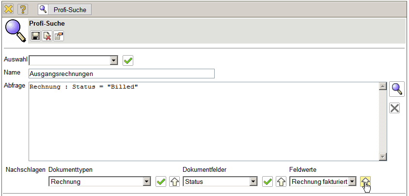 Nach dem Ausführen der Abfrage wird ggf. die Abfrage umformatiert. Im Beispiel wird aus Rechnung : Status = “Rechnung fakturiert” der Ausdruck Rechnung : (Status = “Billed”). Das System setzt in der Regel automatisch Klammern und setzt auch Collections in den Ausdrücken um (hier die Abrechnungsart). Die Transformation der Abfragen muss vom System wegen der Internationalisierung vorgenommen werden, damit unabhängig von der Benutzersprache die Abfragen funktionieren.