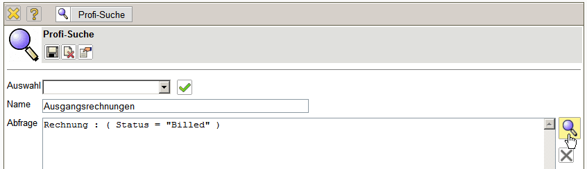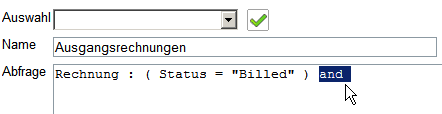 Nach dem Ausführen der Abfrage wird ggf. die Abfrage umformatiert. Im Beispiel wird aus Rechnung : Status = “Billed“ der Ausdruck Rechnung : (Status = “Billed“). Das System setzt in der Regel automatisch Klammern und setzt auch Collections in den Ausdrücken um (hier die Abrechnungsart). Die Transformation der Abfragen muss vom System wegen der Internationalisierung vorgenommen werden, damit unabhängig von der Benutzersprache die Abfragen funktionieren.