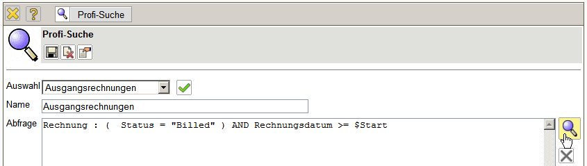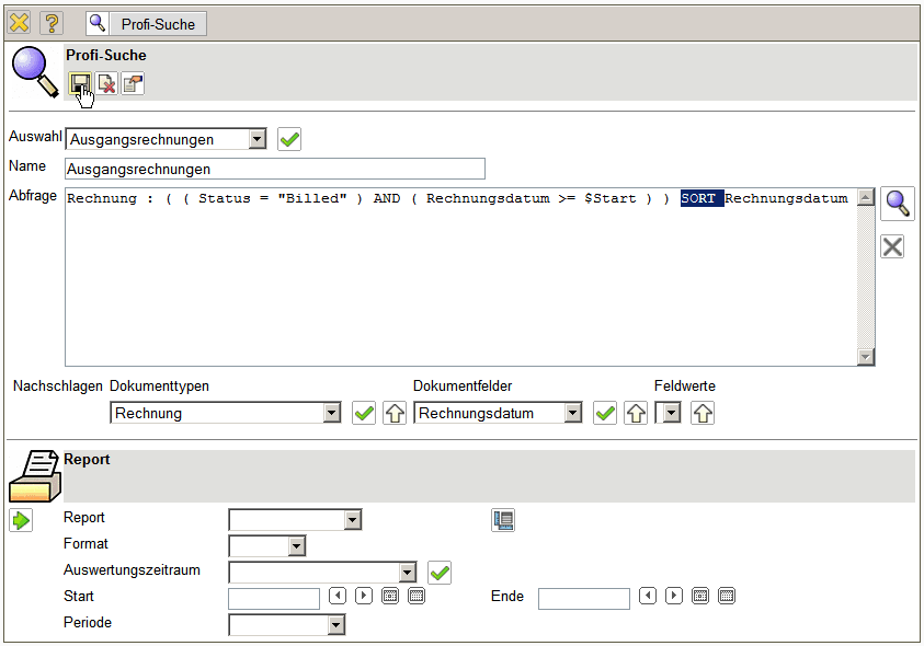 Rechnung : ( ( Status = “Billed” ) AND ( Rechnungsdatum >= $Start ) ) SORT Rechnungsdatum.
