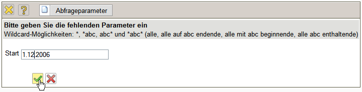 Die zweite Bedingung filtert Rechnungen mit Rechnungsdatum ab einen Start-Wert (Rechnungsdatum >= $Start). In einer Abfrage kann ein Wert (beispielsweise ein Datum “01.12.2006”) hinterlegt werden oder eine Variable. Im Beispiel wird eine Variable $Start als Platzhalter für das Rechnungsdatum verwendet, statt dieses Datum direkt in die Abfrage einzugeben.