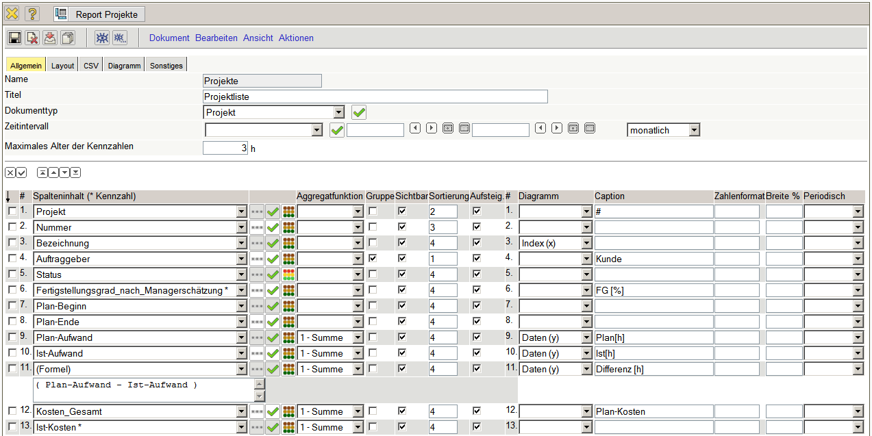 Im Standardreport werden alle Elemente, die sich im Dokument Projekt befinden, als Zeilen aufgeführt (beispielsweise Projekt, Auftraggeber, Ansprechpartner, Projektmanager, …).