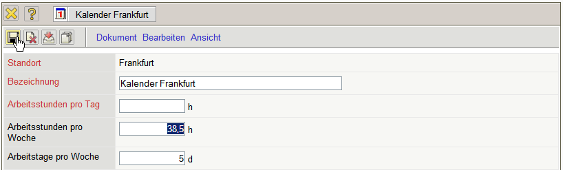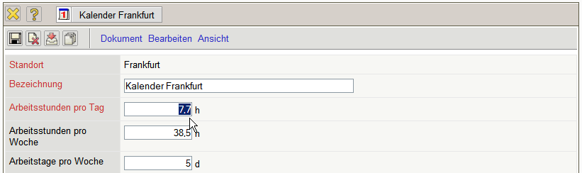 Hier werden nun Änderungen für die Arbeitsstunden pro Woche und die Arbeitstage pro Woche des Kalenders Frankfurt vorgenommen.