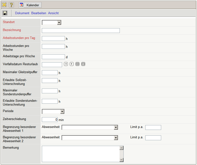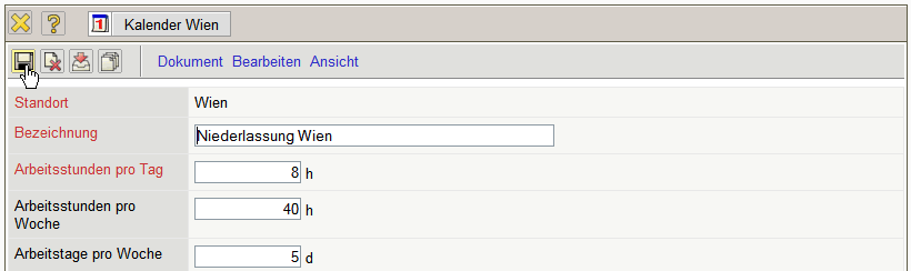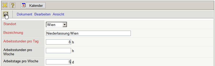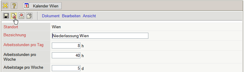 Im Beispiel wird für den Standort Wien (muss zuvor in den Collections angelegt sein - siehe Administrationsleitfaden) die Wochenarbeitszeit von 40 Stunden für fünf Arbeitstage bei einer Tagesarbeitszeit von acht Stunden definiert. Die weiteren Angaben beziehen sich auf die Arbeitszeitverwaltung.