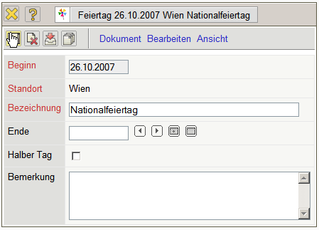 Im Beispiel wird für den Standort Wien (muss zuvor als Kalender definiert sein) der Nationalfeiertag für 2007 definiert. Wenn alle Informationen eingegeben sind, wird das Dokument mit