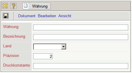 Um eine neue Währung zu definieren, wählt man im Arbeitsbereich in der Funktionalität “Anlegen” den Dokumenttyp “Währung” aus.