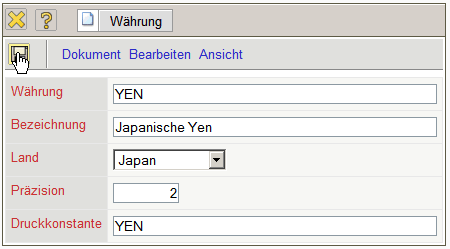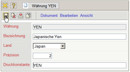 Im Beispiel wird der Japanische Yen angelegt. Die Druckkonstante (hier JPY) wird ggf. bei der Zweitwährung und den Fakturadokumenten verwendet.