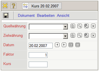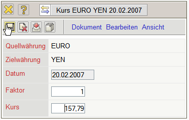 Im Beispiel wird ein Umrechnungskurs zwischen EURO und YEN definiert. Dieser Kurs ist vom 12.05.2004 gültig, bis ein neuer Kurs eingegeben wird. Hier entspricht 1 EUR genau 134,3248 JPY. Wenn alle Informationen eingegeben sind, wird das Dokument mit gespeichert.