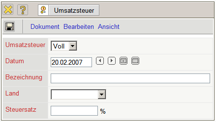 Um einen neuen Umsatzsteuersatz zu definieren (beispielsweise wg. Steuererhöhung oder Eröffnung einer Auslandsgesellschaft), wählt man im Arbeitsbereich in der Funktionalität “Anlegen” den Dokumenttyp “Umsatzsteuer” aus.