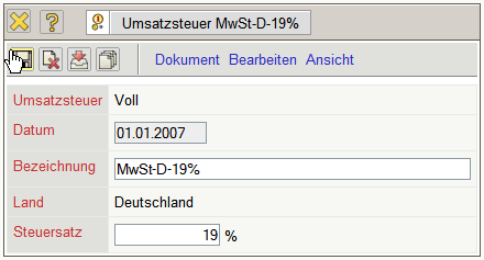 Im Beispiel wird eine neue Umsatzsteuer für Deutschland definiert. Wenn alle Informationen eingegeben sind, wird das Dokument mit gespeichert.