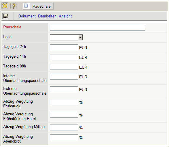 Um eine neue Pauschale für die Reisekostenerfassung zu definieren (beispielsweise für Auslandsreisen), wählt man im Arbeitsbereich in der Funktionalität “Anlegen” den Dokumenttyp “Pauschalen” aus.