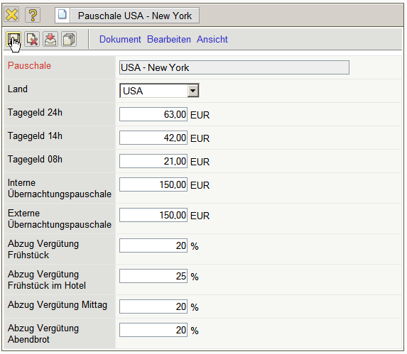 Im Beispiel werden die Tagegeld- und Übernachtungspauschalen für New York (abweichend vom Satz der USA) definiert. Wenn alle Informationen eingegeben sind, wird das Dokument mit gespeichert.