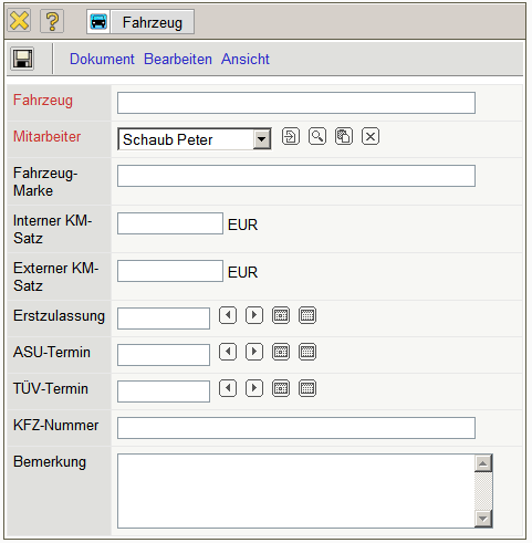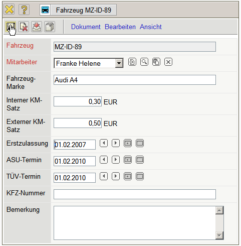 Wenn alle Informationen eingegeben sind, wird das Dokument mit gespeichert. Die Felder ASU-Termin und TÜV-Termin werden dabei vom System gefüllt.