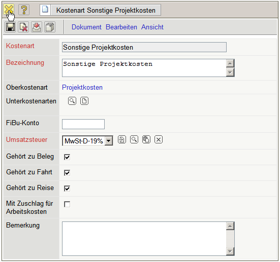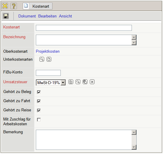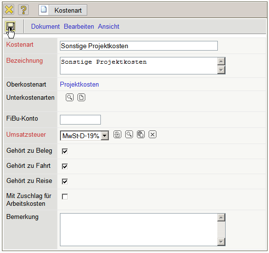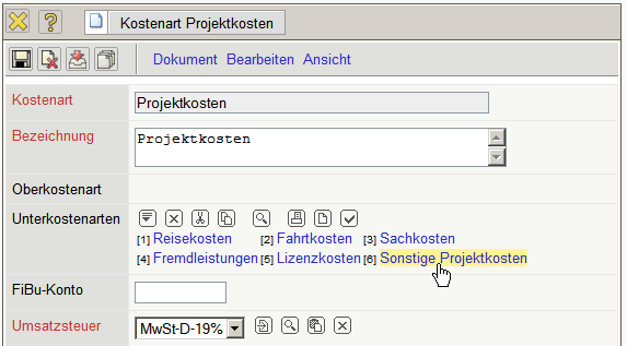 Das System erzeugt ein neues Dokument vom Typ “Kostenart” und belegt die Oberkostenart automatisch mit den “Projektkosten” vor. Anschließend werden die restlichen Eingaben definiert …