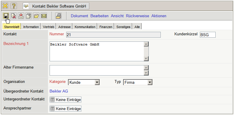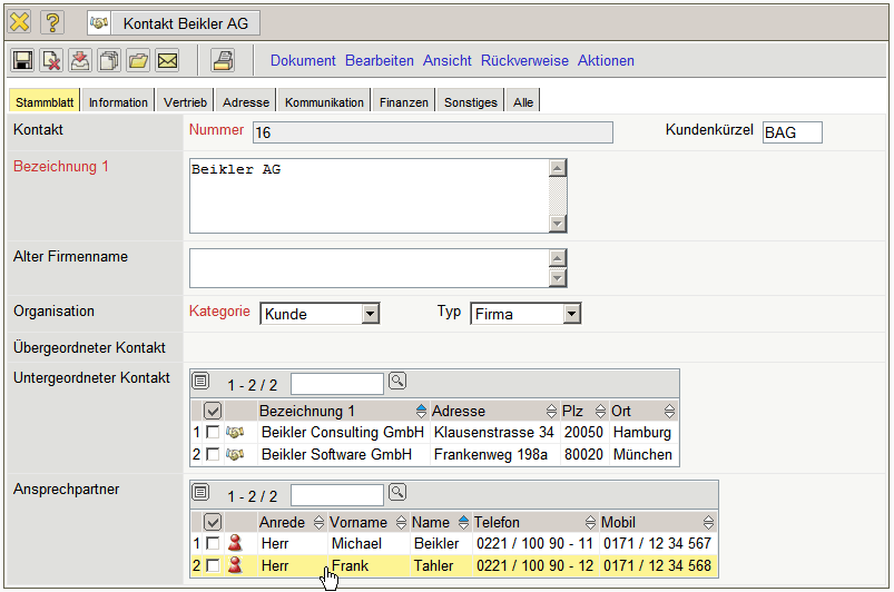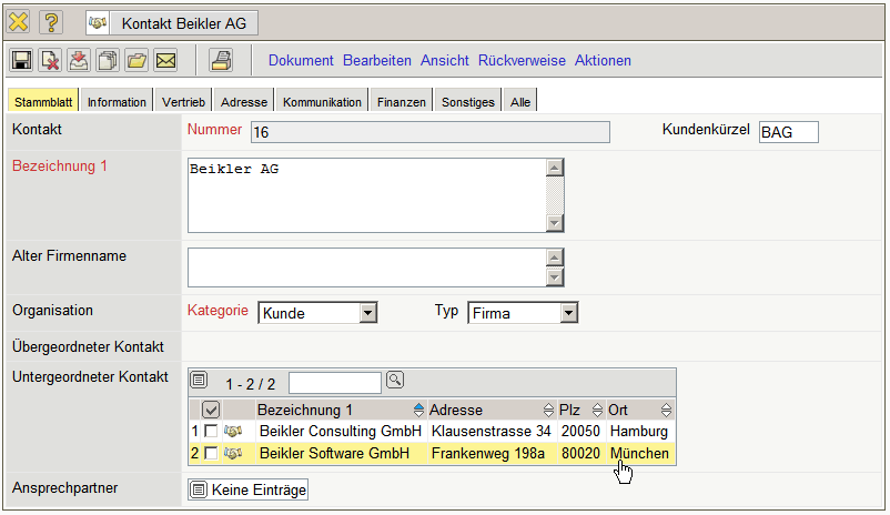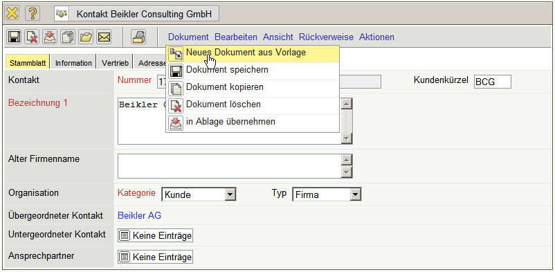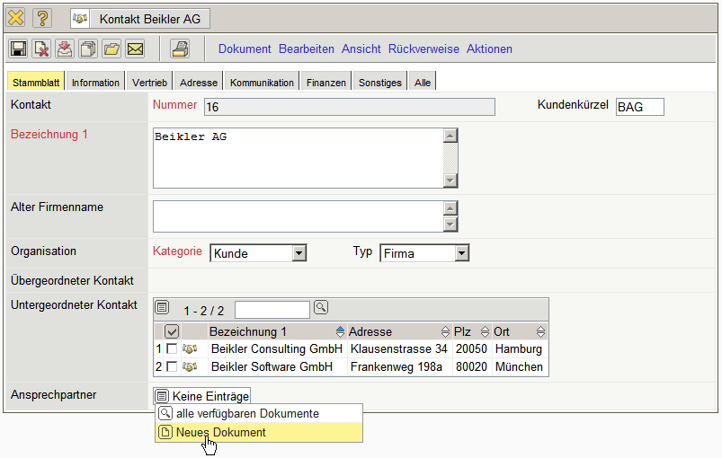 Kontakte können auch weiter unterteilt werden. Im folgenden Beispiel besteht die Firma Beikler AG aus zwei Tochterunternehmen. Mit Hilfe der Funktionalität “Neues Dokument” im Feld “Untergeordneter Kontakt” …