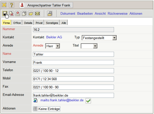 Das System erzeugt ein neues Dokument vom Typ “Ansprechpartner” und belegt den Kontakt (und einige Daten aus dem Kontakt) automatisch vor.